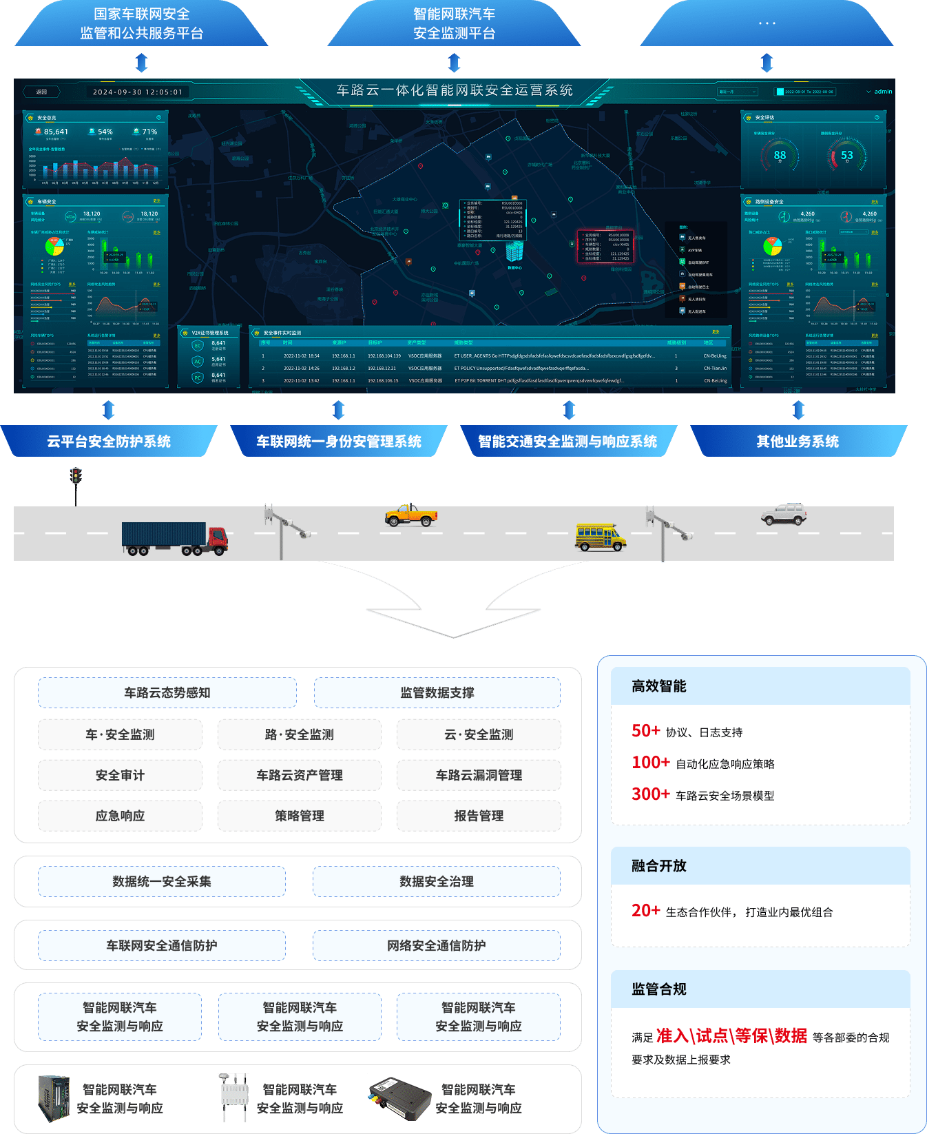 车路云一体化安全体系,构建“云-管-端”全域协同防御架构,整合车 / 路 / 云态势感知、安全监测、威胁分析、身份管理、应急响应等能力,依托 50 +协议、100 +自动化应急策略、300 +安全模型,联动20 +生态伙伴,满足智能网联汽车准入等合规要求,打造体系化安全底座 ,实现 “监测-防御-分析-响应” 闭环,支撑车路协同规模化落地。