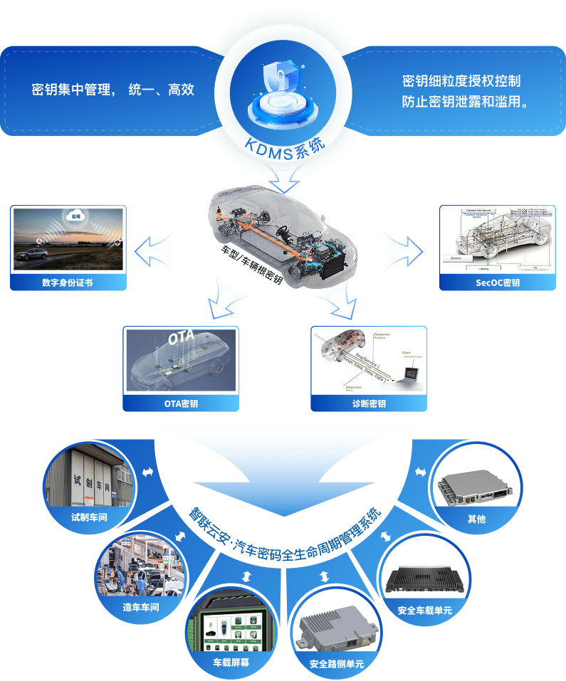 聚焦企业实际需求,提供定制化密钥管理解决方案,覆盖密钥全生命周期管控、零部件灌装、多场景业务适配、跨组织分发、售后维护五大核心能力,为全产业链提供安全灵活的密码支撑体系。