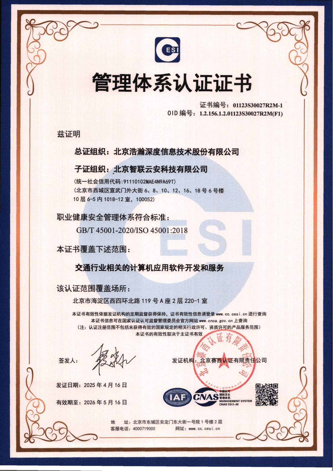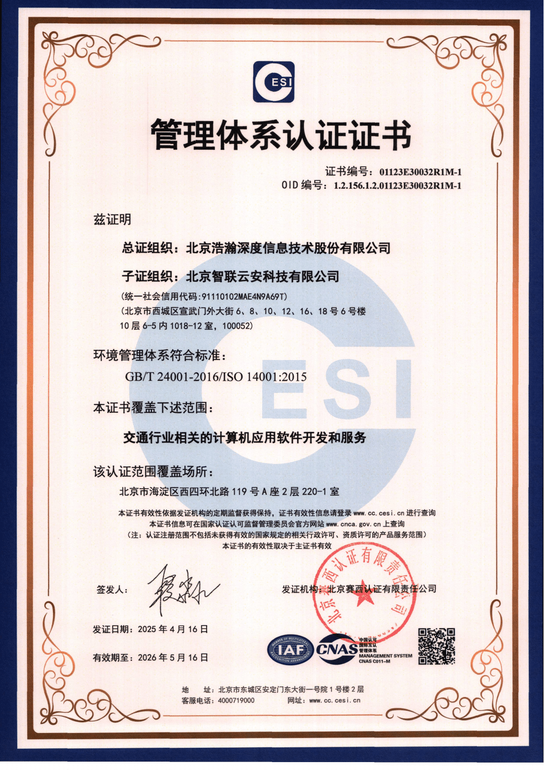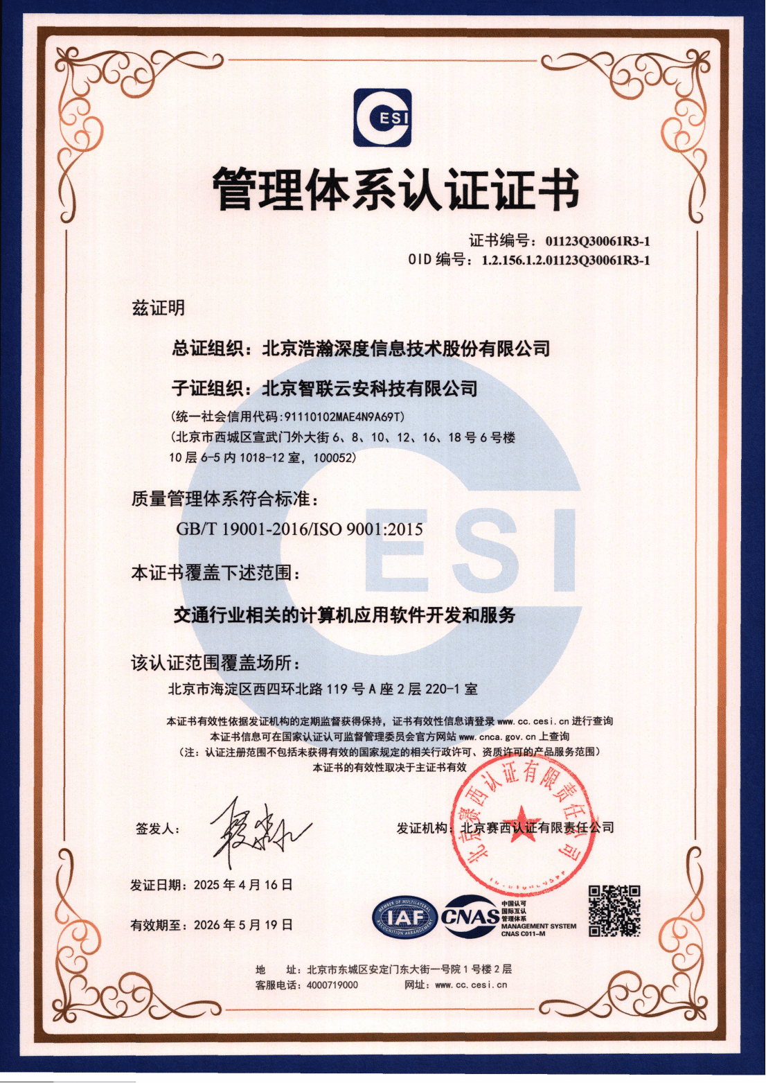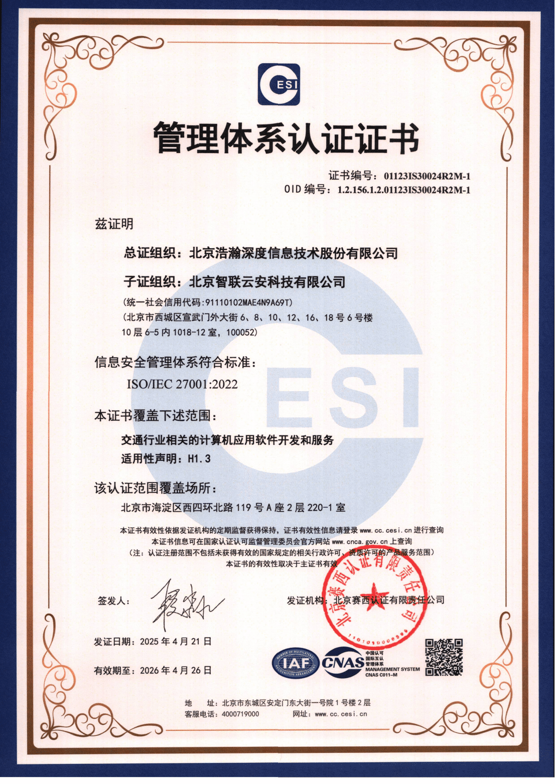 智联云安作为北京浩瀚深度信息技术股份有限公司(股票代码:688292)的控股子公司,聚焦车联网领域,以成为智能网联汽车中国方案安全引领者为目标,面向车企、城市运营商、移动运营商、政府监管等多元客户,提供智能网联汽车安全监测与运营、整车信息安全防护、车路云一体化安全防护与运营、汽车大数据安全治理等全周期解决方案,从多维度助力客户满足安全合规要求、降低安全风险、提升安全管理能力,赋能产业持续高质量发展。目前,公司已取得信息安全管理体系、质量管理体系、环境健康管理体系及职业健康管理体系四项 ISO 认证,以标准化管理体系为业务发展夯实根基。