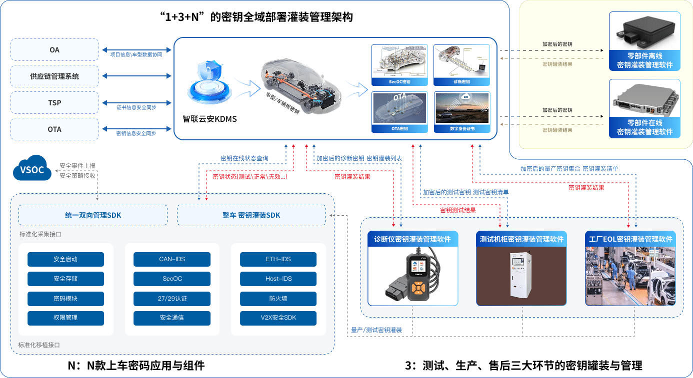 汽车密码一站式解决方案,以智联云安密钥灌装管理系统(KDMS)为核心中枢 ,覆盖研发、测试、生产、售后全流程密钥管控,赋能车端安全启动、安全存储、密码模块、总线防护等 N 类密码应用,构建汽车密码全域安全管理闭环,为智能网联汽车植入 “数字信任基因” ,筑牢全生命周期安全合规底座。